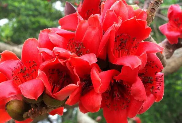 木棉之美,在于其 高大挺拔、苍劲阳刚,每年3-4月间,枝头缀满千万朵红艳艳的硕大花朵,近看是朵朵火苗,远看是把把火炬,大片浓艳的花朵如火焰熊熊燃烧,美得豪气张扬、美得热烈奔放,即使花落时也不改容、不变色,垂直坠下,落地有声。
